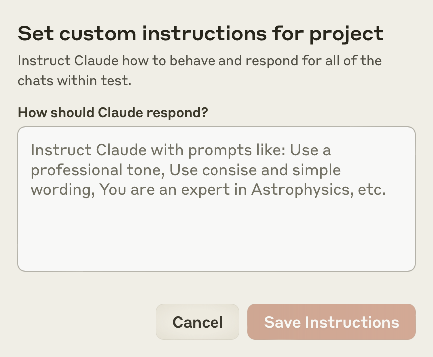 더불어, 각 프로젝트에 대해 사용자 지정 지침을 정의하여 Claude의 응답을 더욱 세밀하게 조정할 수 있습니다. 예를 들어, Claude에게 더 공식적인 어조를 사용하거나 특정 역할 또는 산업의 관점에서 질문에 답하도록 지시할 수 있습니다.